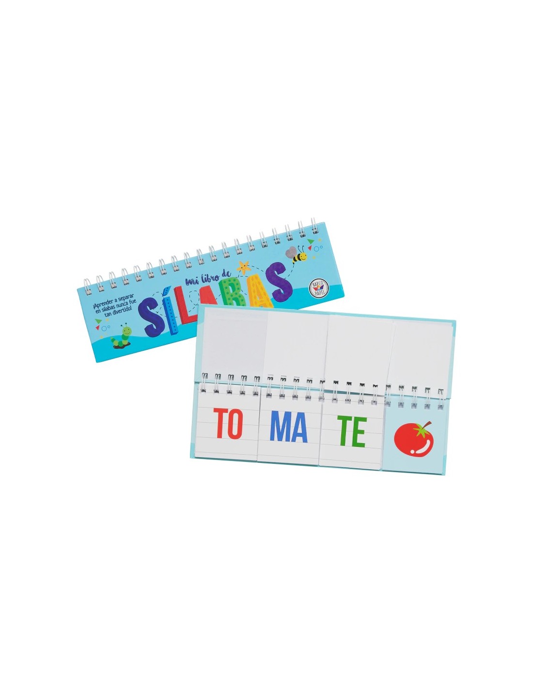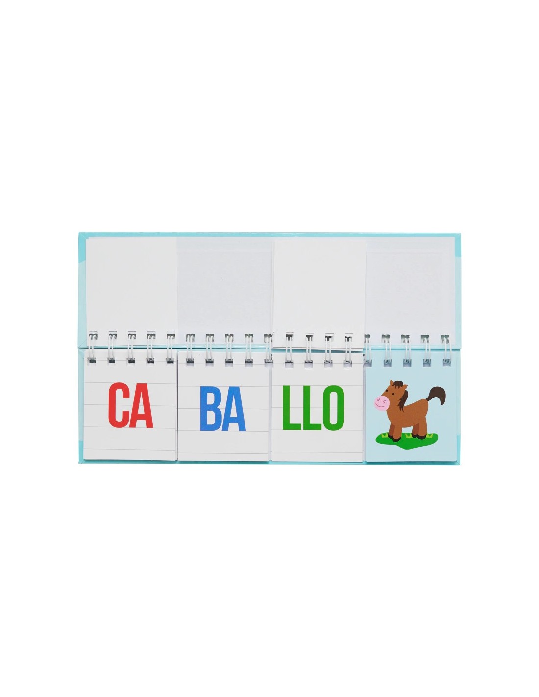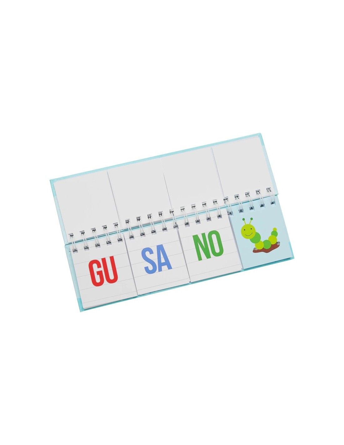 Libro móvil de tapa dura de cartón montado, anillado reforzado y hojas laqueadas de  25 x 8 cm. Incluye tres columnas con sílabas intercambiables y una imagen ilustrativa.