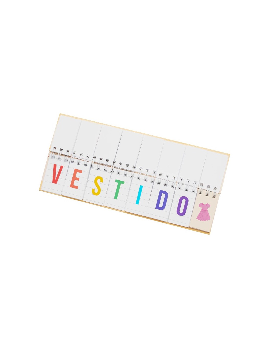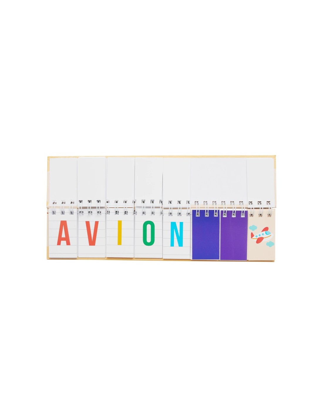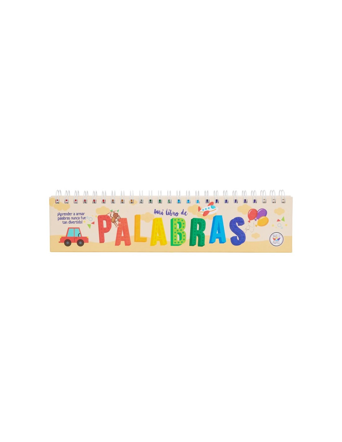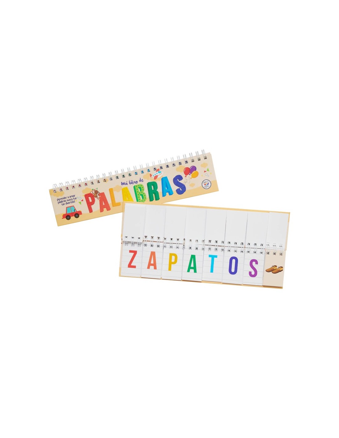 Libro móvil de tapa dura de cartón montado, anillado reforzado y hojas laqueadas de 32 x 8 cm. Incluye siete columnas de abecedarios, las hojas se rotan y al combinarlas ayuda a los niños a aprender a leer y escribir. Contiene imagenes de referencia. Se puede armar cualquier palabra que tenga entre dos y siete letras. Para usar también en inglés.