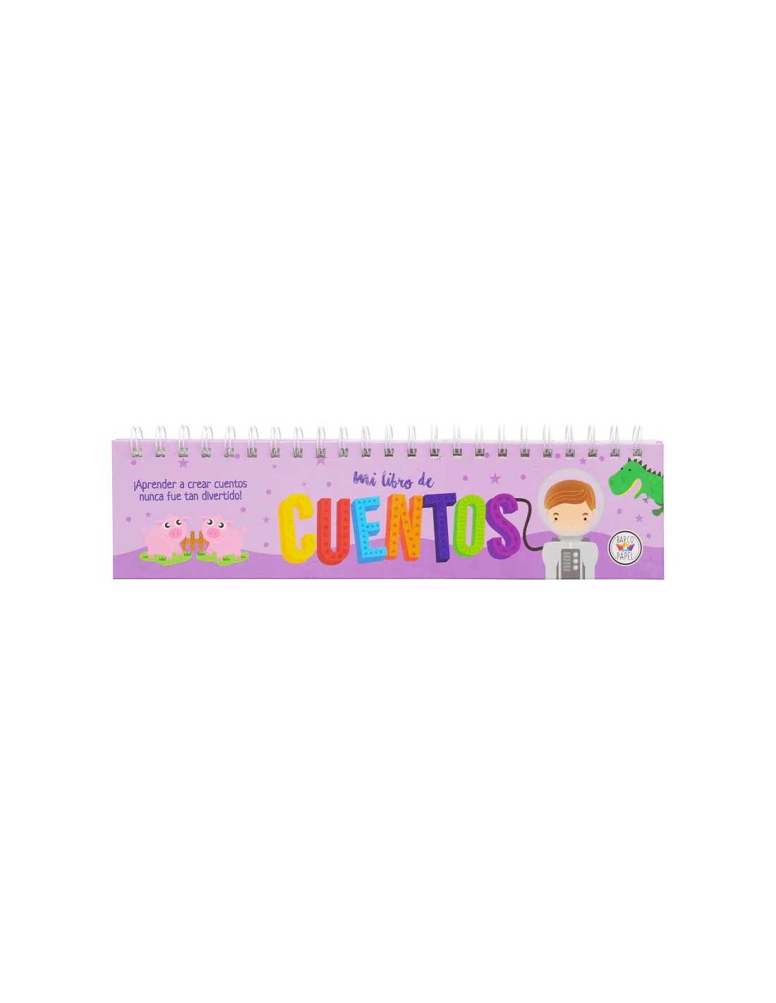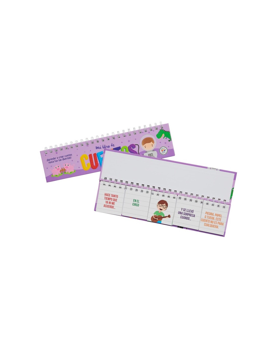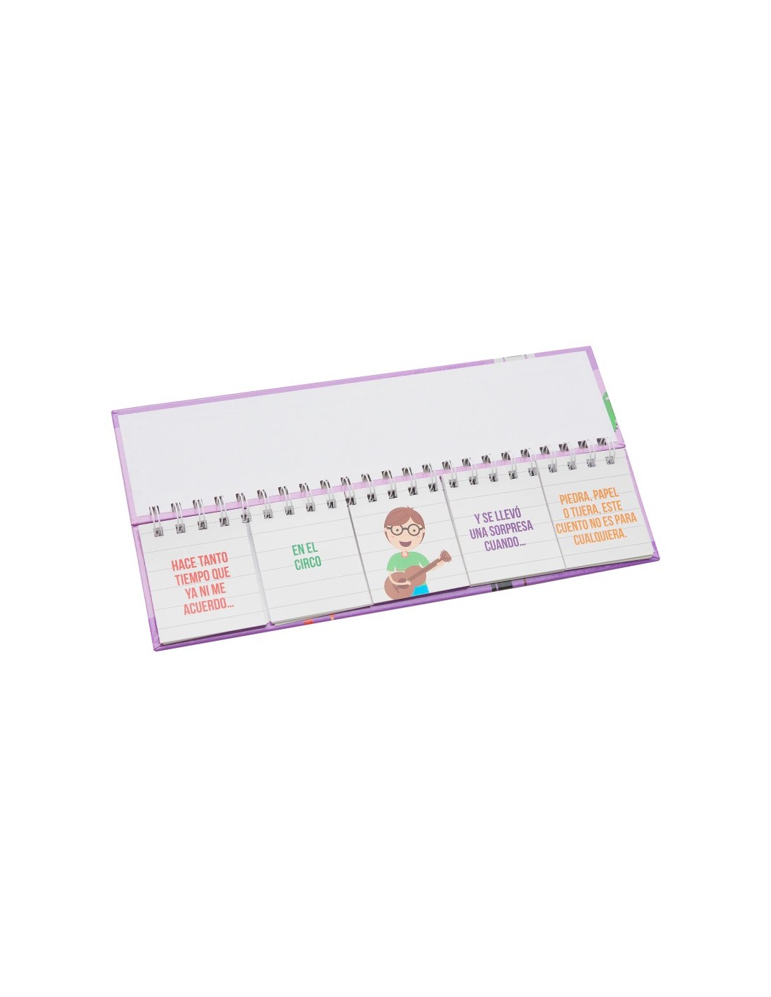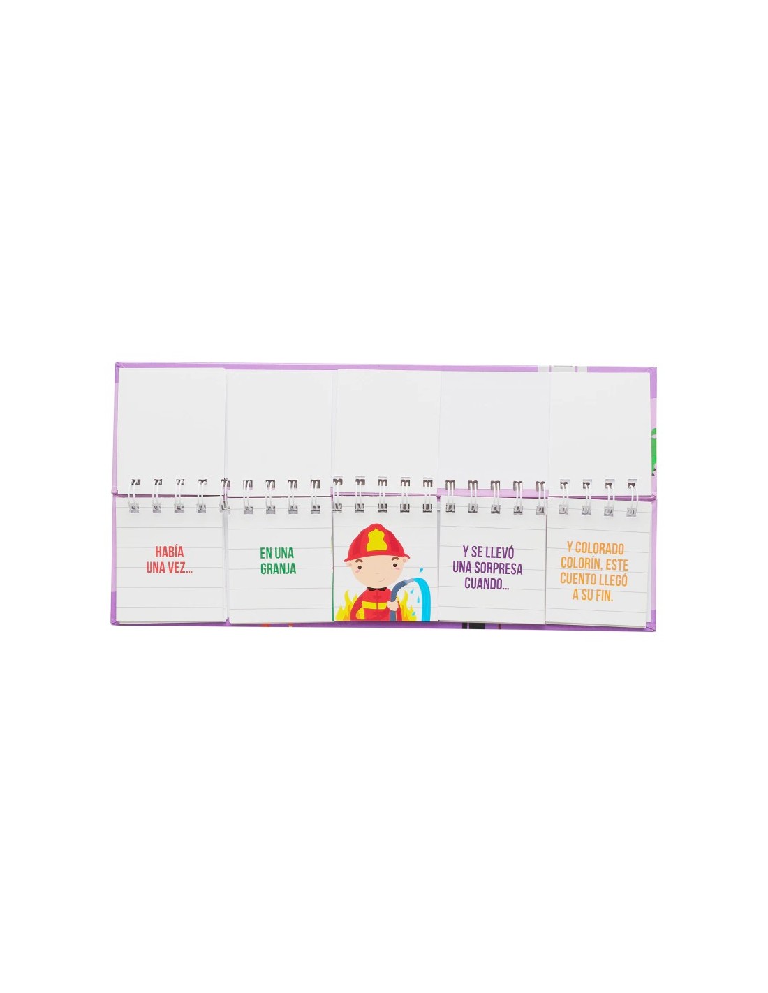 Libro móvil de tapa dura en cartón montado, con anillado reforzado y hojas laqueadas de 30 x 8 cm. Incluye cuatro columnas intercambiables que permiten crear distintos cuentos, junto con una ilustración de un personaje para acompañar la narración.