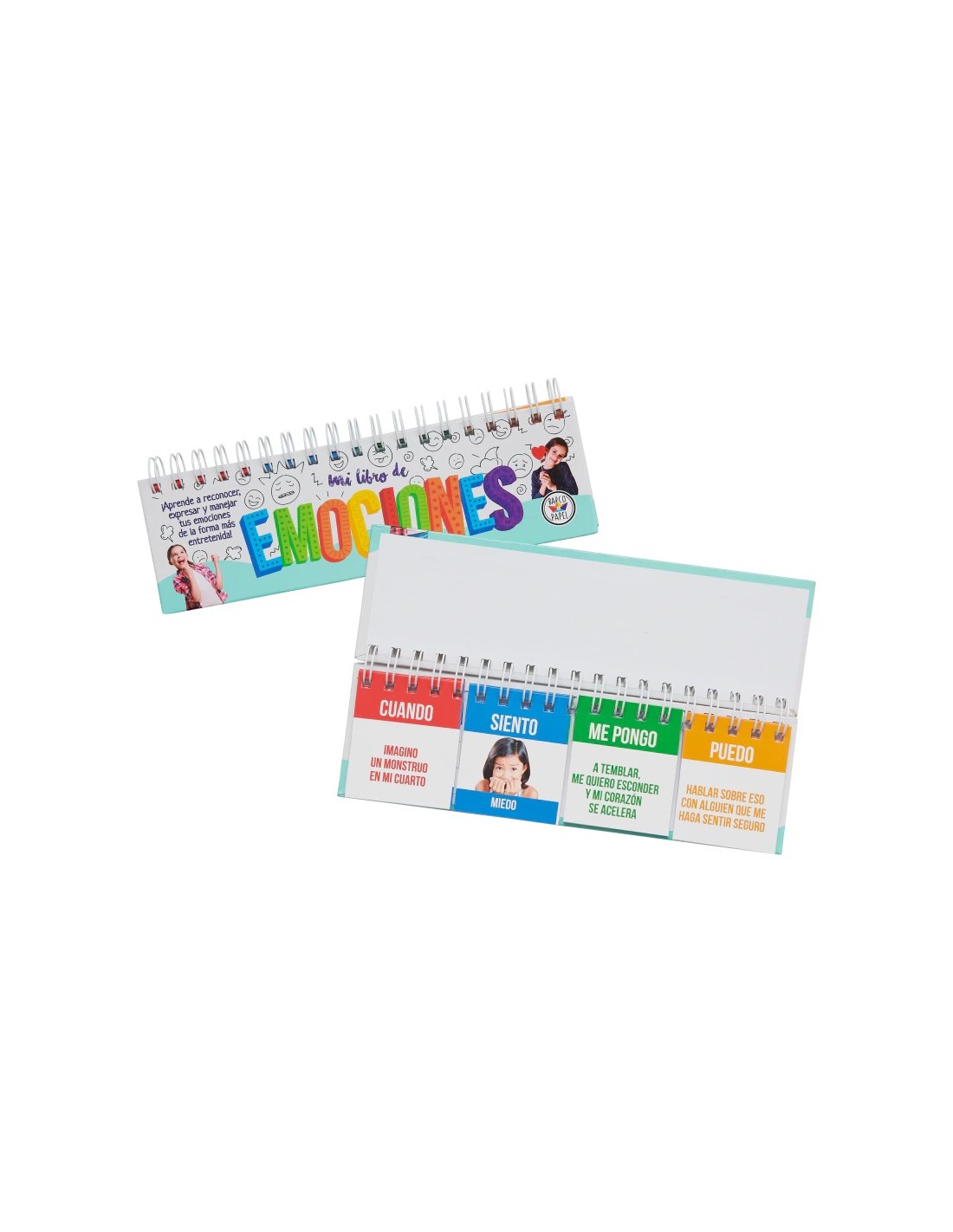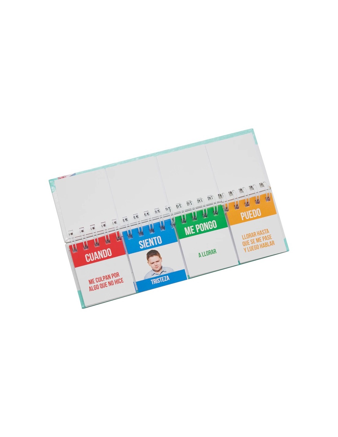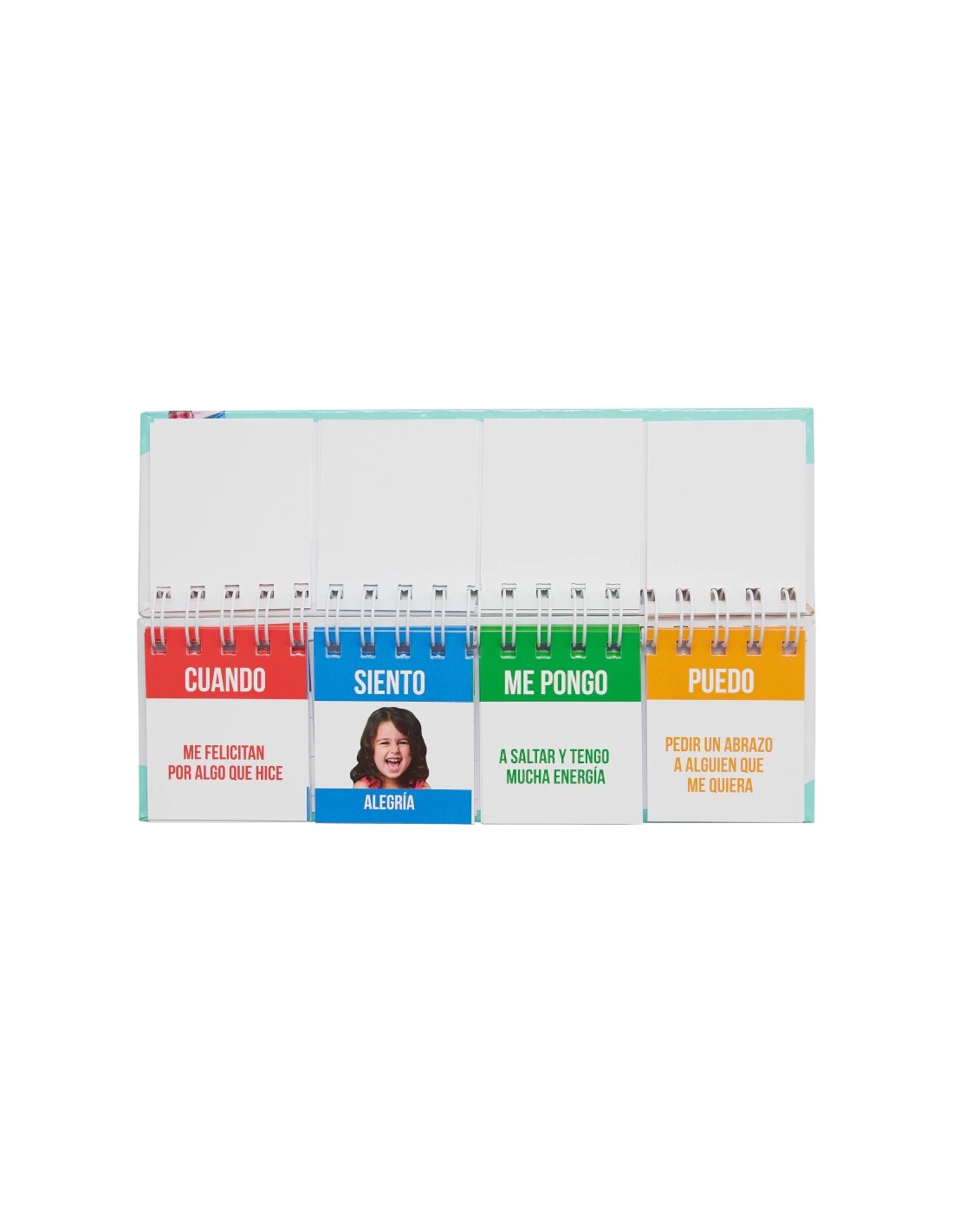 Libro móvil de tapa dura de cartón montado, anillado reforzado y hojas laqueadas de 25 x 8 cm. Incluye cuatro columnas: “cuando”, “siento”, “me pongo” y “puedo”. Este recurso permite reconocer, expresar y manejar las emociones de manera clara y sencilla.