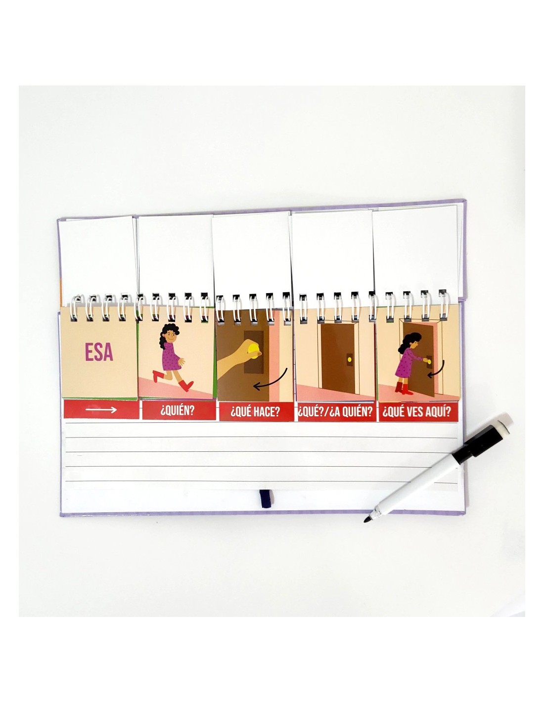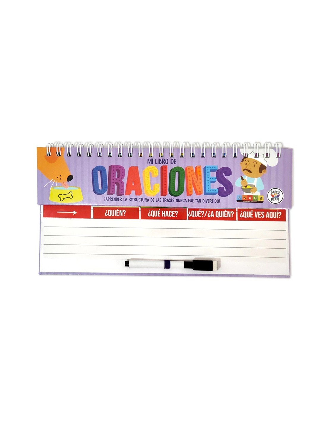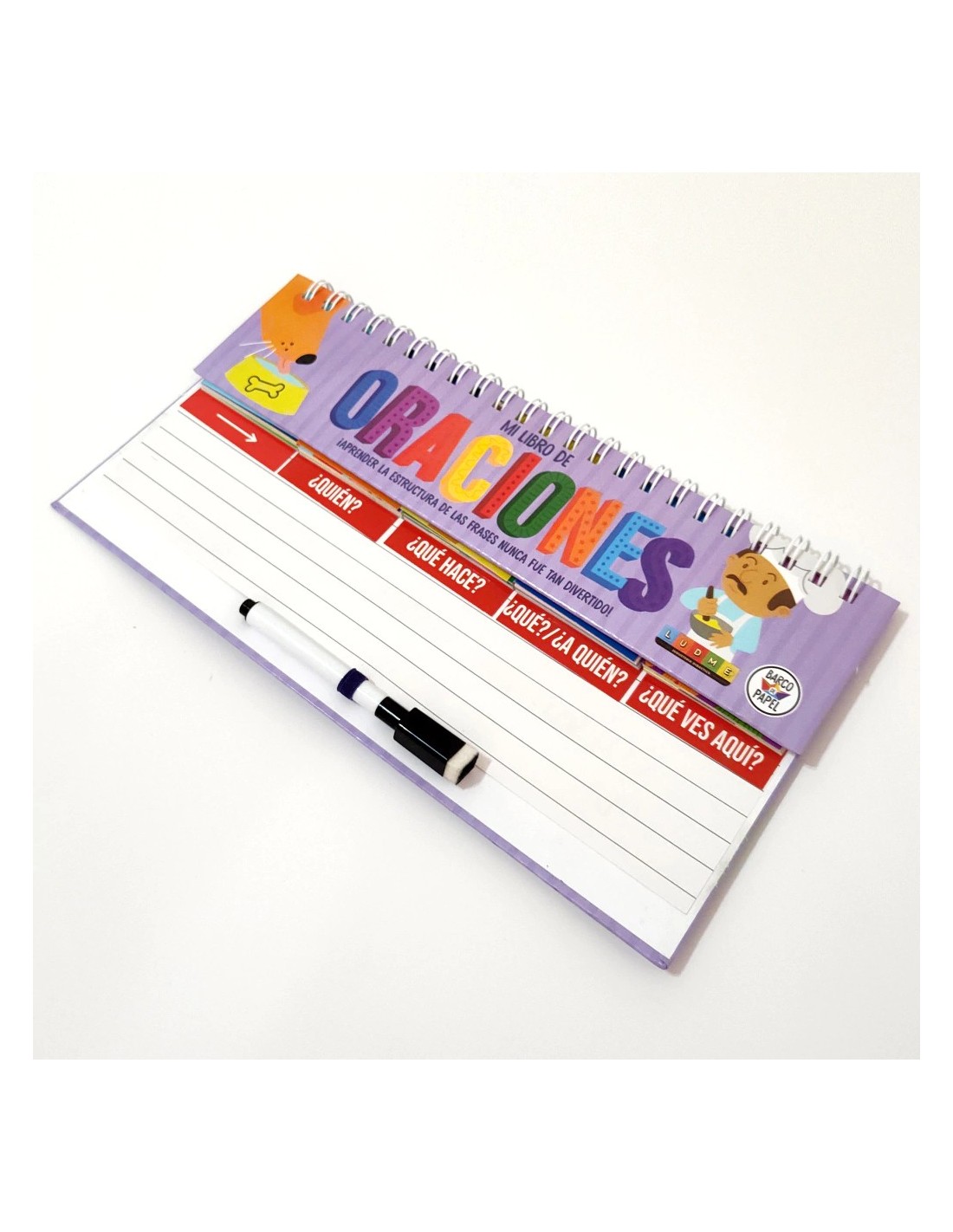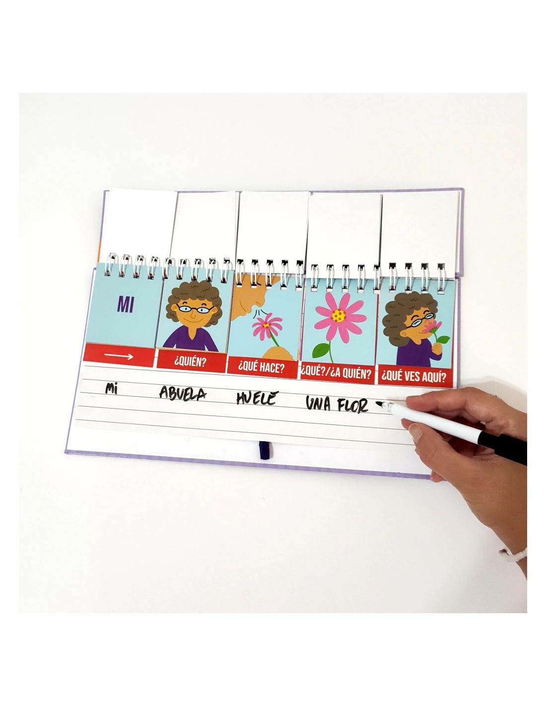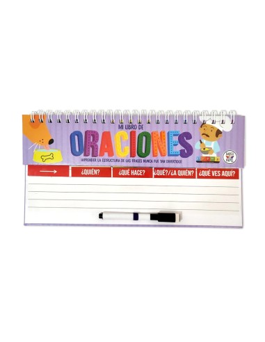Libro móvil de tapa dura de cartón montado, anillado reforzado y hojas laqueadas de 31 x 17 cm. Incluye cuatro columnas ilustradas que facilitan la creación de oraciones completas de forma sencilla y entretenida, estimulando el desarrollo del lenguaje y la creatividad.