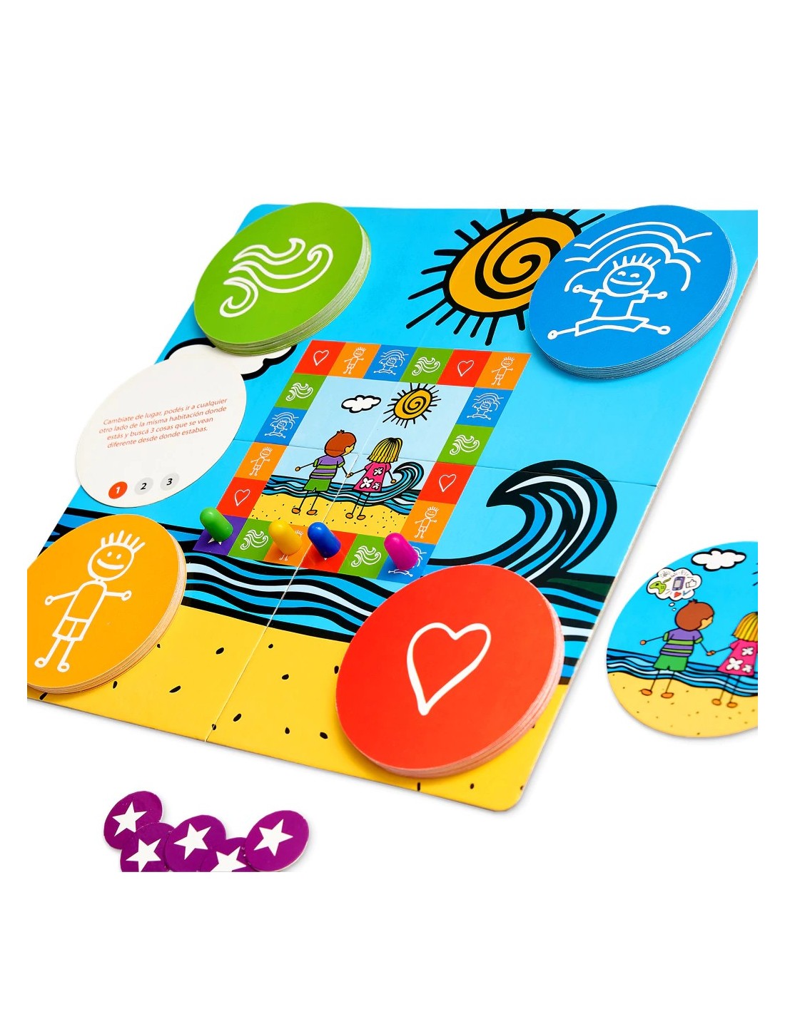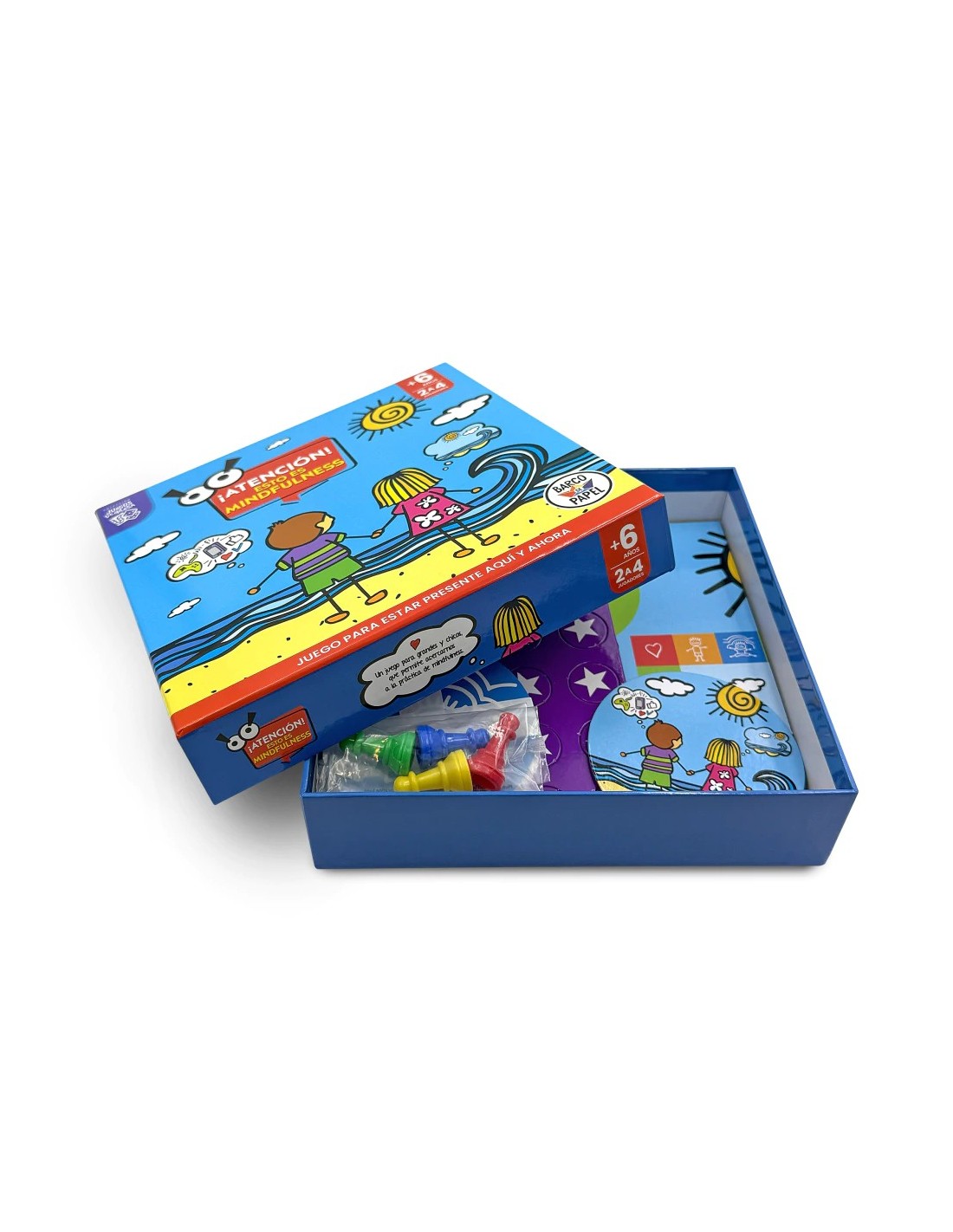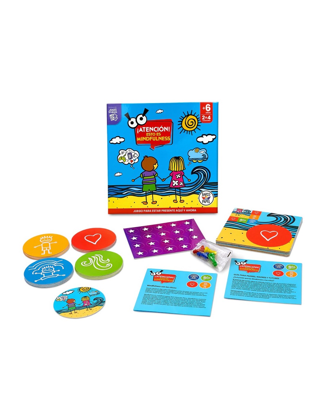 1 tablero, 60 tarjetas, 4 fichas, 1 medalla, fichas estrella, instructivo y guía de mindfulness.
