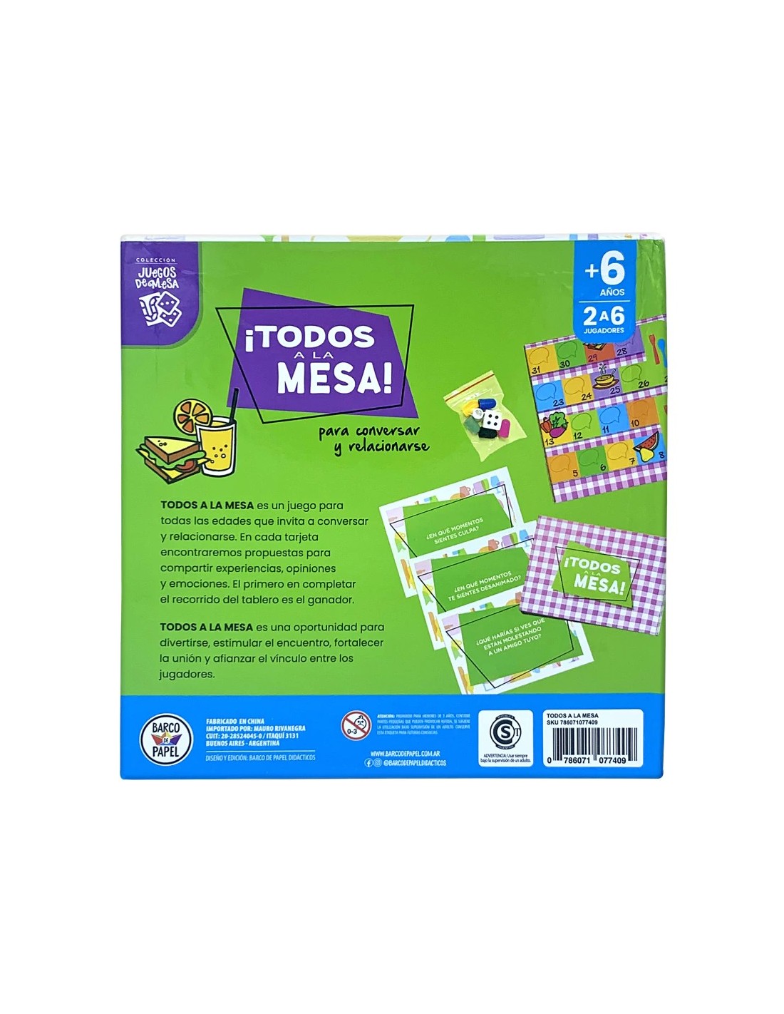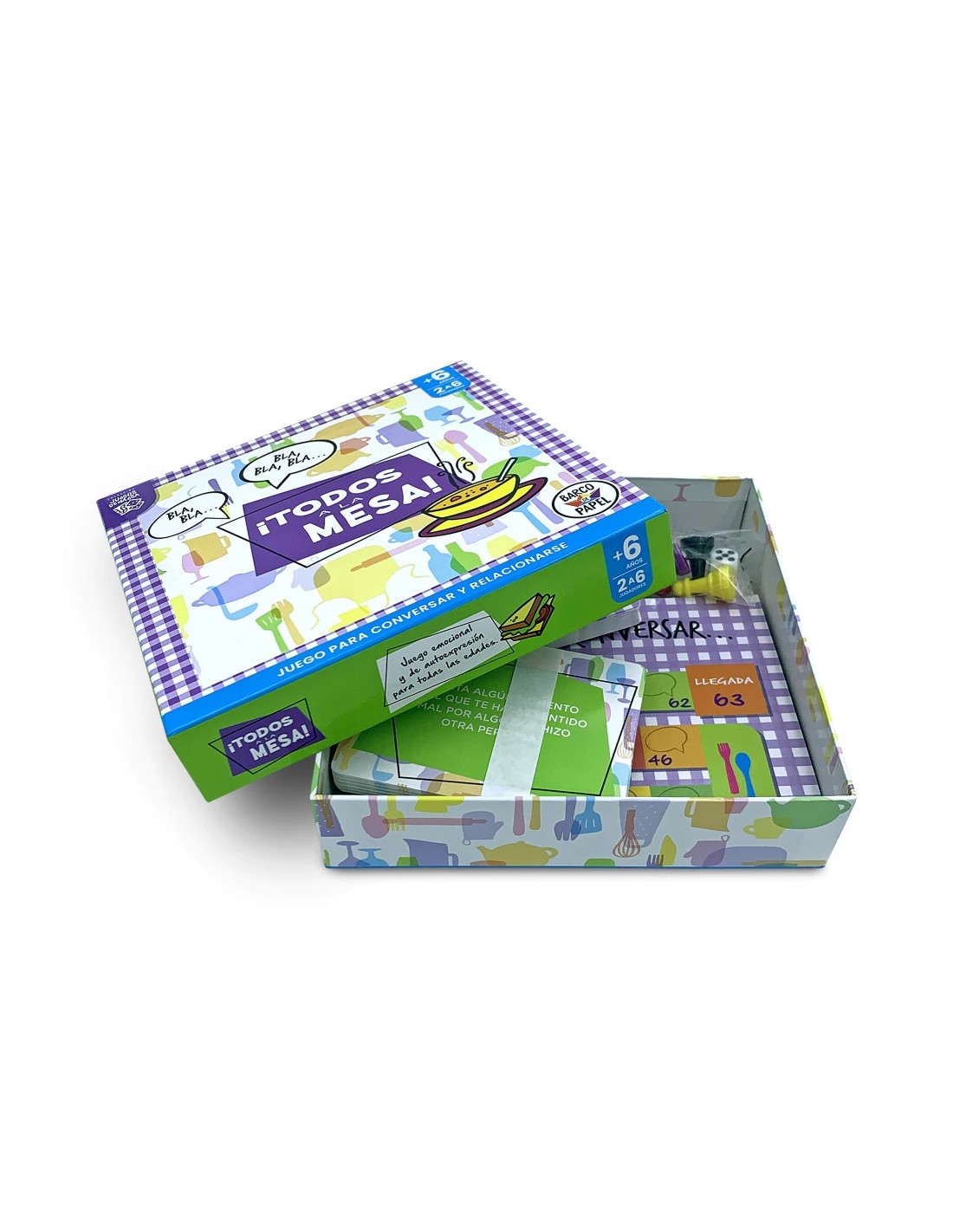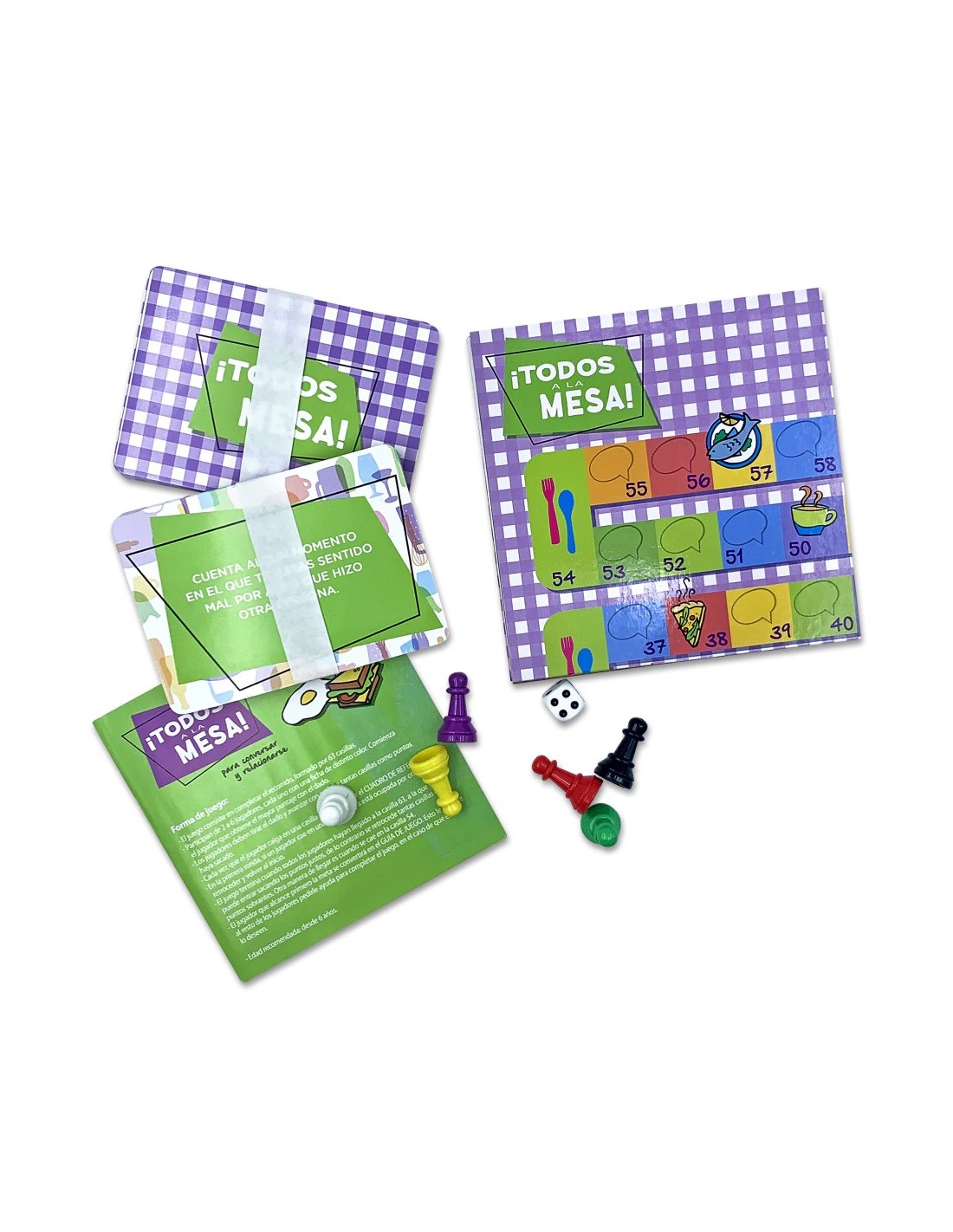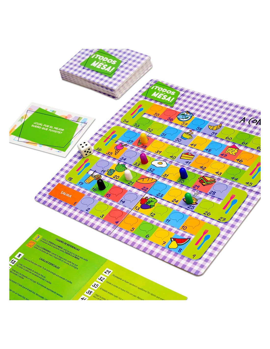 1 tablero, 60 tarjetas con consignas, 6 fichas de colores, 1 dado e instructivo.